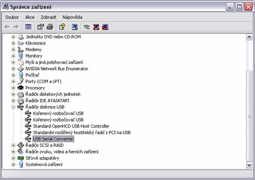 Správně nainstalovaný hardware můžeme nalézt ve správci zařízení jako „USB Serial Converter“.