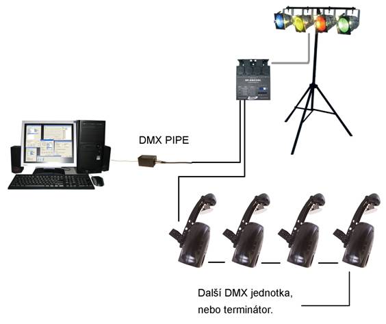 K DMX PIPE lze připojit libovolná technika komunikující protokolem DMX512. Propojení jednotlivých modulů je formou sběrnice, kde k poslední jednotce musí být připojen terminátor. Nepřipojujte zařízení stylem hvězda nebo jinou nevhodnou topologií. Řízení jednotek je na sobě nezávislé a jejich adresa se nastavuje podle tabulky uvedené výrobcem.