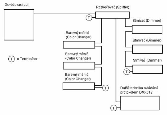 protokolu DMX512/1998 Z přenosové rychlosti 250 kBit/s vyplývají následující časové údaje: Doba trvání jednoho bitu je 4 ms a datového rámce 44 ms (11 bitů). Celý přenos s celkovým počtem 512 datových bajtů má délku trvání danou následující rovnicí: Break + MAB + (1 + 512) * rámec = 88 + 8 + 513 * 44 = 22668 ms Z toho vyplývá nejvyšší opakovací frekvence přibližně 44,12 Hz při plně využité sběrnici. Tato hodnota je pro naše účely dostačující. Další stavy, které se mohou na sběrnici objevit, jsou dlouhodobý výskyt vysoké, nebo nízké úrovně. Pakliže je delší než 1 s, je stav vyhodnocen jako ztráta signálu. Reakce na tento stav je nechána na libovůli výrobce. Často zařízení setrvávají v naposledy nastavené pozici, někdy se resetují. Samotné moduly jsou zapojeny v topologii sběrnice, kde na straně vysílače a přijímače musí být zakončovací odpor (terminátor). Lze použít také rozbočovačů (splitters) a opakovačů (repeaters). Příklad takového zapojení modulů je uveden na obrázku 4.2.